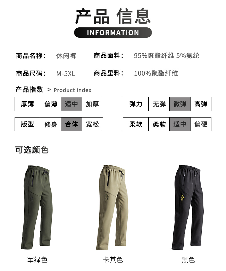 8989加绒加厚棉裤 95聚酯纤维5氨纶 里料100聚酯纤维 军绿/卡其/黑 M-5XL